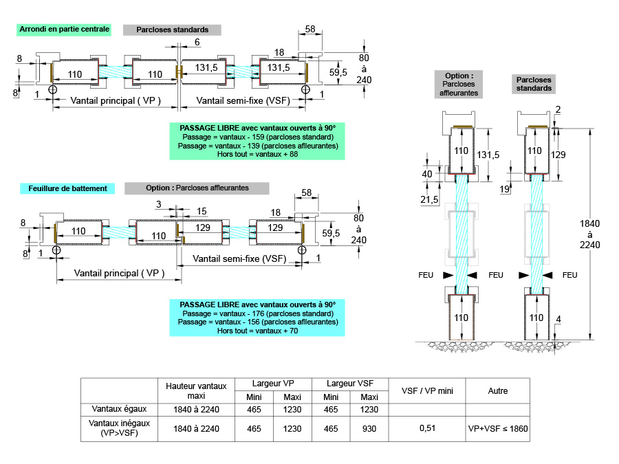 - Les arrondis en partie centrale peuvent être remplacés par une feuillure de battement, avec sélecteur de fermeture SP 81 et entraineur de sécurité DS 90 (LEVASSEUR) et semi-fixe équipé de deux verrous automatiques VAM (LAPERCHE).
