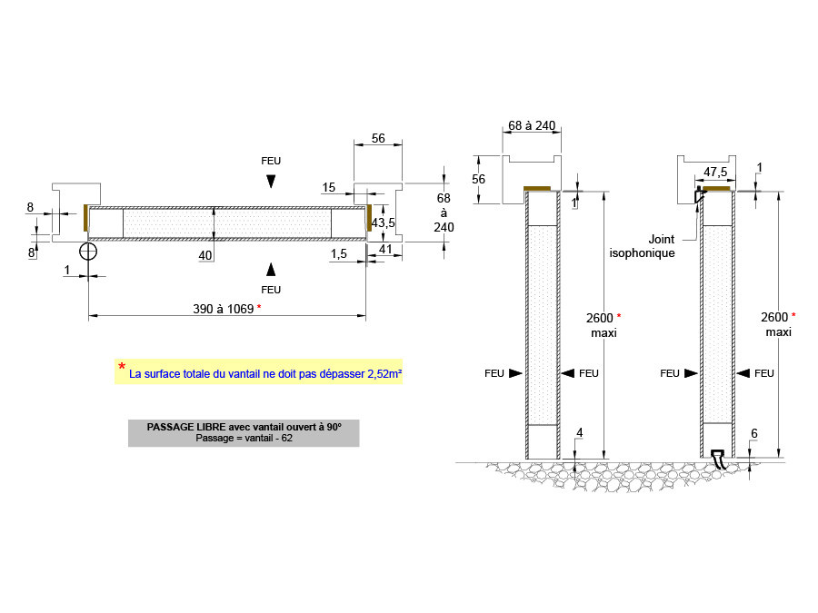 Non fourni par CROUZILLES - Epaisseur maxi 25 mm - Largeur maxi 180 mm - Fixation par colle (Essence identique au bloc-porte) - sauf charnières encastrées