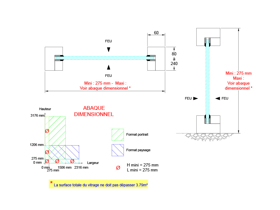 Dimensions maximales du vitrage format portrait : (H x L) 3100 x 1430 mm - Surface maxi : 3,79 m²