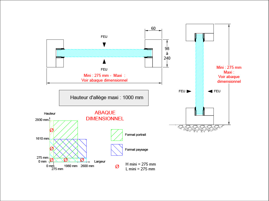 Dimensions maximales du vitrage format paysage : (H x L) 1540 x 2530 mm