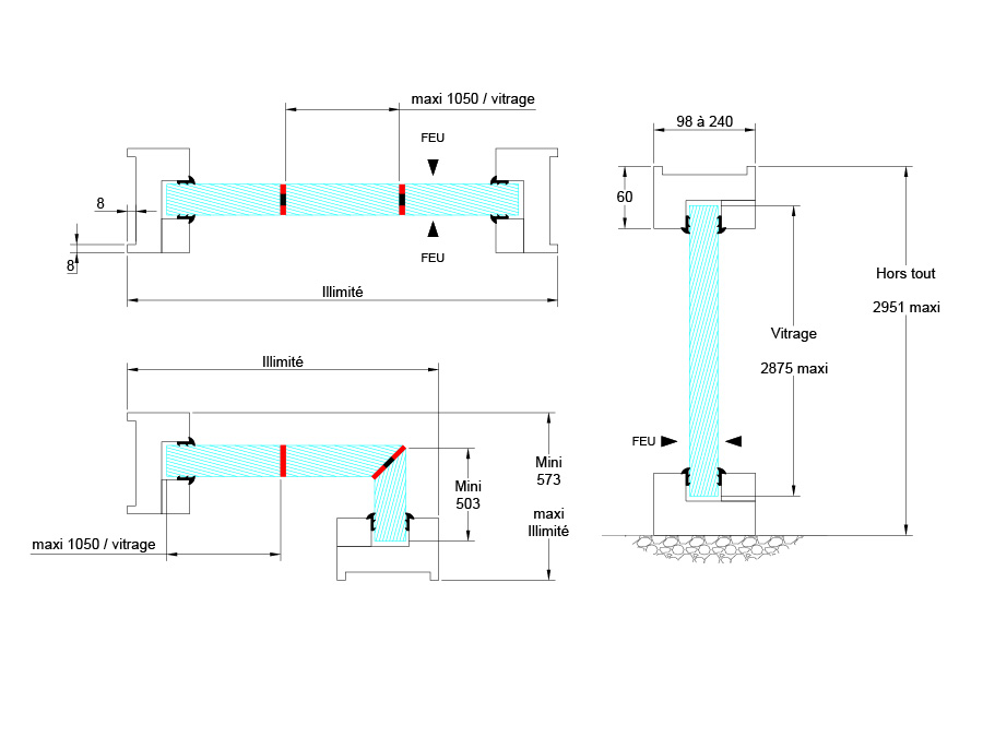 Dimensions maximales du vitrage format portrait : (H x L) 2875 x 1050 mm, largeur mini 510 mm