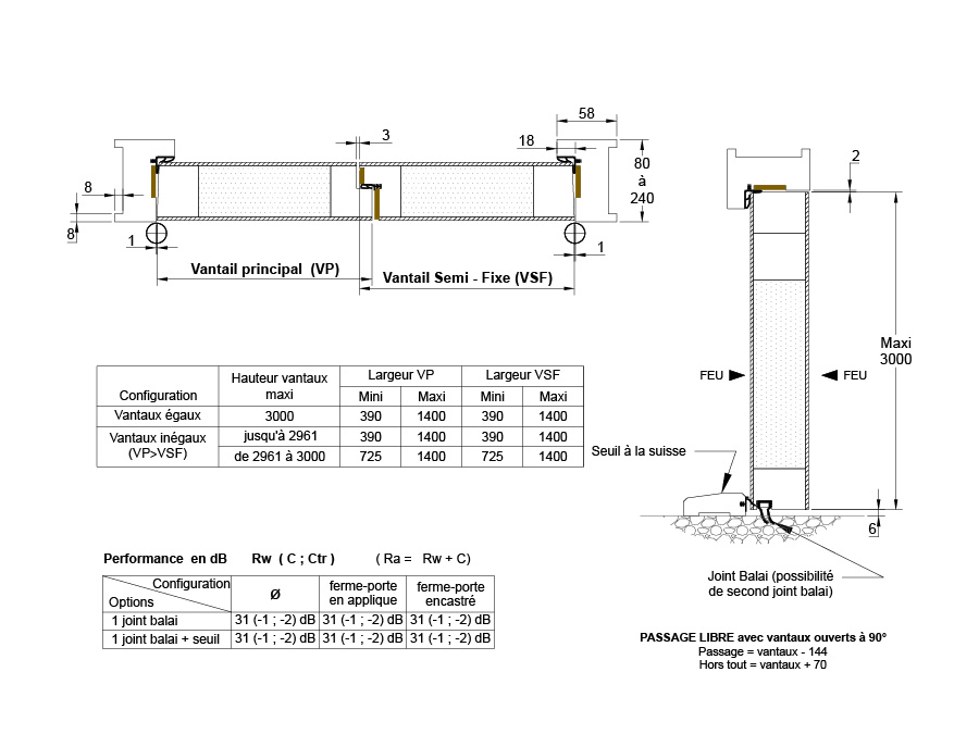 Encastrés dans feuillure de battement (1 joint balai uniquement) : - Rw (C ; Ctr) = 31 (-1 ; -2) dB