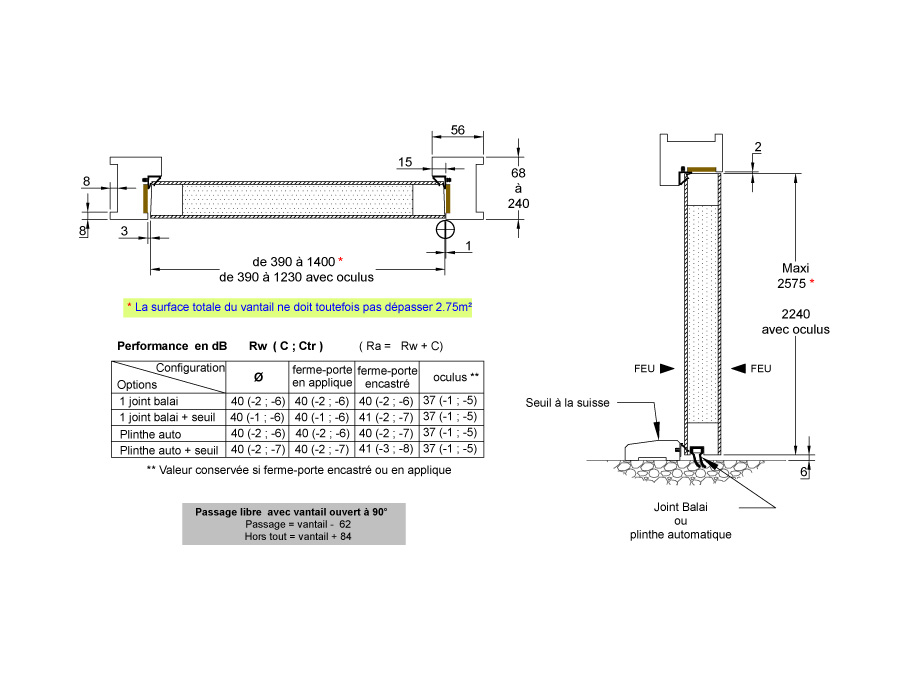 1 rectangulaire de 1400 x 300 mm maximum - position à 150 mm mini des chants du vantail