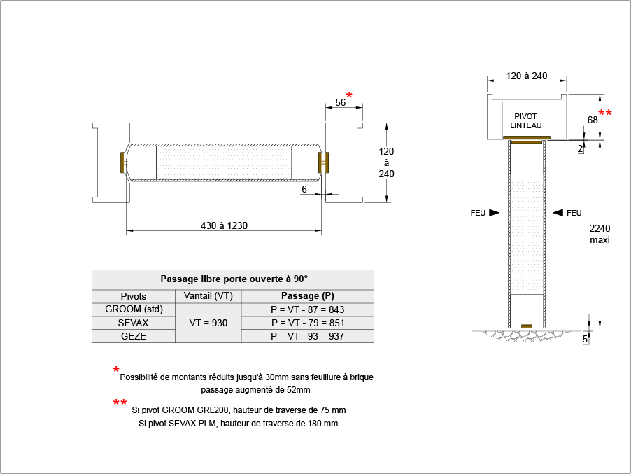 HUISSERIE type à chapeau - TRAVERSE (120 à 240) X 68 mm MINI, MONTANTS STD (120 à 240) X 30 mm (sans rainure à brique) à 56 mm - TALON sur mesure, Standard de 50 mm - Joint feu posé