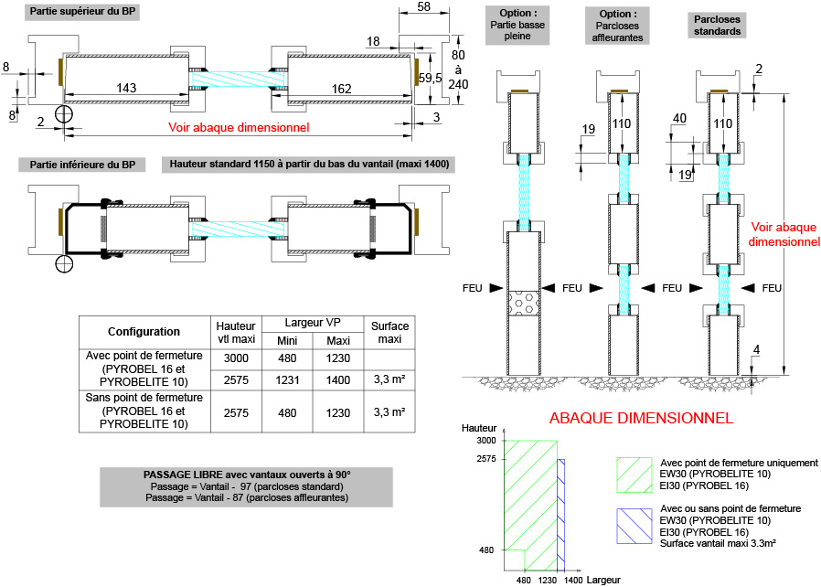 EI30 : PYROBEL 16 et 16 EG (vantail d'épaisseur 62 mm avec contrefeuillures)