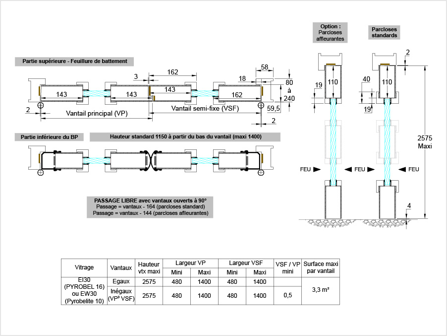Largeur montants de 143 mm mini et traverses de 110 mm mini