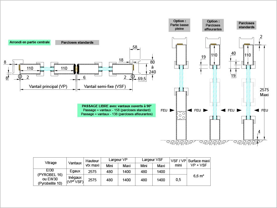 EI30 : PYROBEL 16 et 16 EG (vantaux d'épaisseur 62 mm avec contrefeuillures)