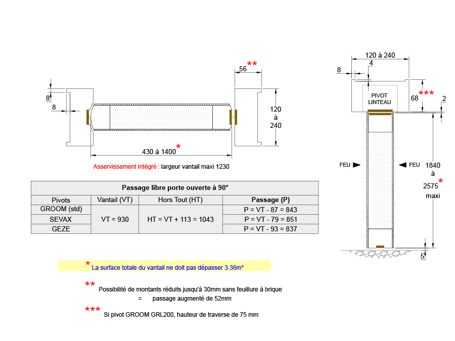 Possibilité d’équiper ce bloc-porte avec PYROBEL 16 (le BP restant EI 30) ou avec PYROBELITE 7 EG et PYROBELITE 10 (le BP devenant EW 30) en 1600 x 400 maximum à condition de laisser 150 mm de chaque côté.