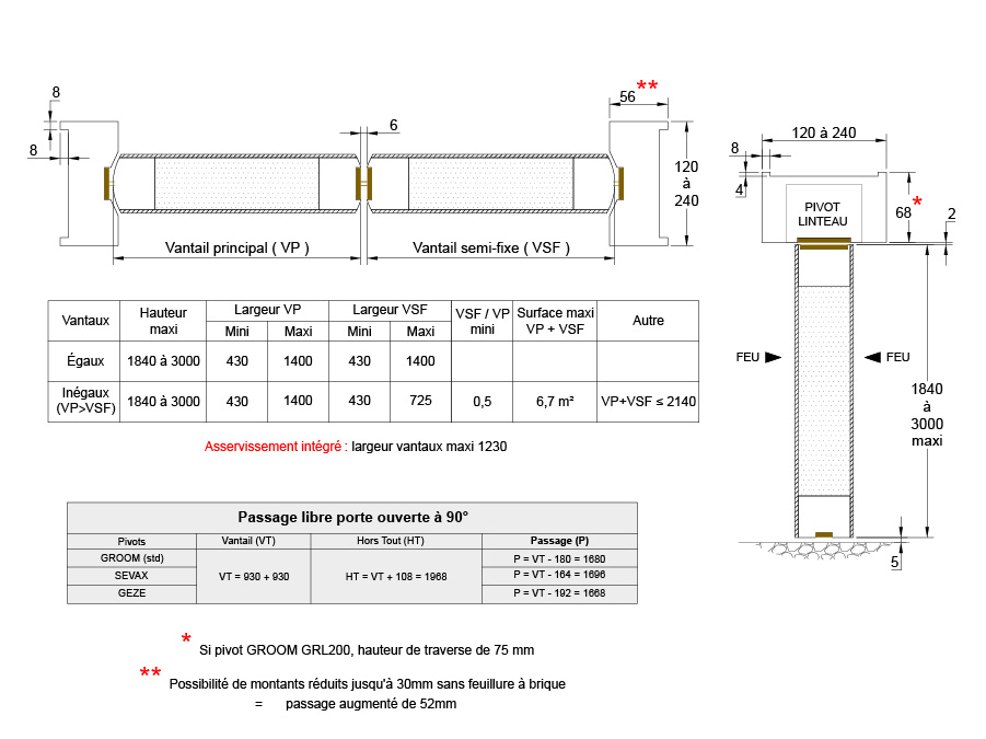 Possibilité d’équiper ce bloc-porte avec PYROBEL 16 (le BP restant EI 30) ou avec PYROBELITE 7 EG et PYROBELITE 10 (le BP devenant EW 30) en 1600 x 400 maximum à condition de laisser 150 mm de chaque côté.
