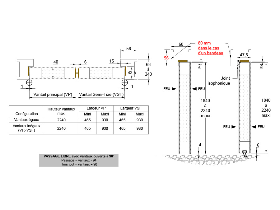 - Possibilité d’équiper l’huisserie avec joint isophonique qualité “feu”. Celui-ci étant livré avec lèvres reliées par une languette, il est impératif de l’enlever avant utilisation et balai en partie basse de chaque vantail.
