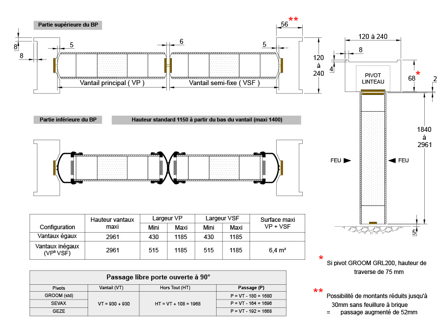 Possibilité d’équiper ce bloc-porte avec PYROBEL 16 (le BP restant EI 30) ou avec PYROBELITE 7 EG et PYROBELITE 10 (le BP devenant EW 30) en 1600 x 400 maximum à condition de laisser 150 mm de chaque côté.