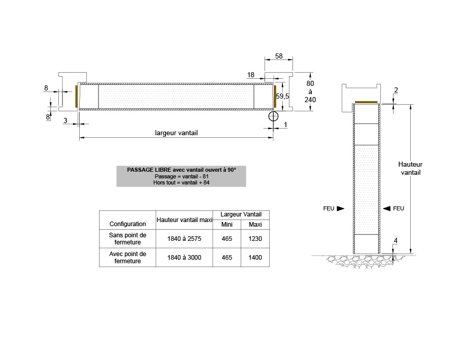Possibilité d’équiper ce bloc-porte avec PYROBEL 25 en 1600 x 400 maximum ou diamètre 300 - 400 ou 500, à condition de laisser 150 mm de chaque côté.