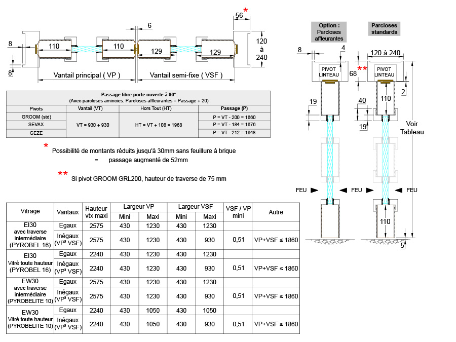 - PYROBELITE 7 EG et PYROBELITE 10 (l’ensemble devenant EW 30) avec vantail de 2575 x 1050 OU vitrage de 1610 de haut maximum x 1230 de vantail en largeur avec une traverse intermédiaire.