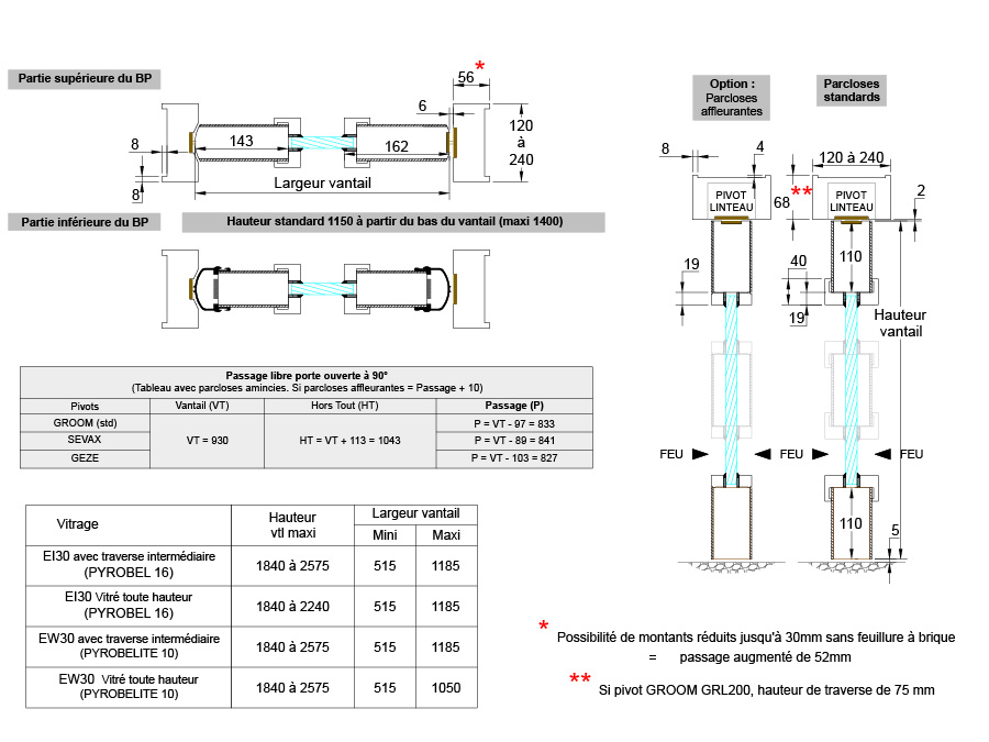 - PYROBELITE 7 EG et PYROBELITE 10 (l’ensemble devenant EW 30) avec vantail de 2575 x 1050 OU vitrage de 1610 de haut maximum x 1185 de vantail en largeur avec une traverse intermédiaire.