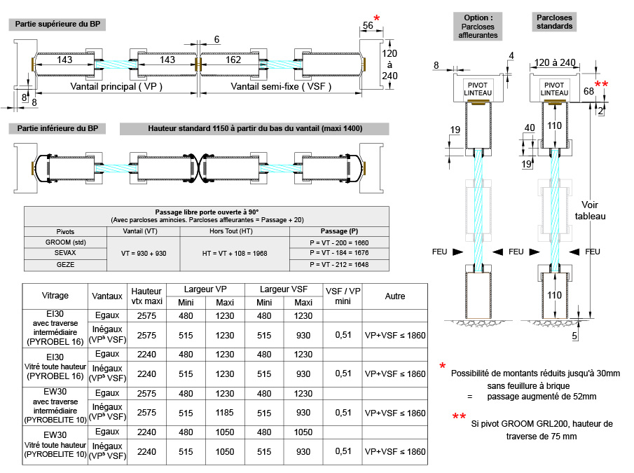 - PYROBELITE 7 EG et PYROBELITE 10 (l’ensemble devenant EW 30) avec vantail de 2575 x 1050 OU vitrage de 1610 de haut maximum x 1185 de vantail en largeur avec une traverse intermédiaire.